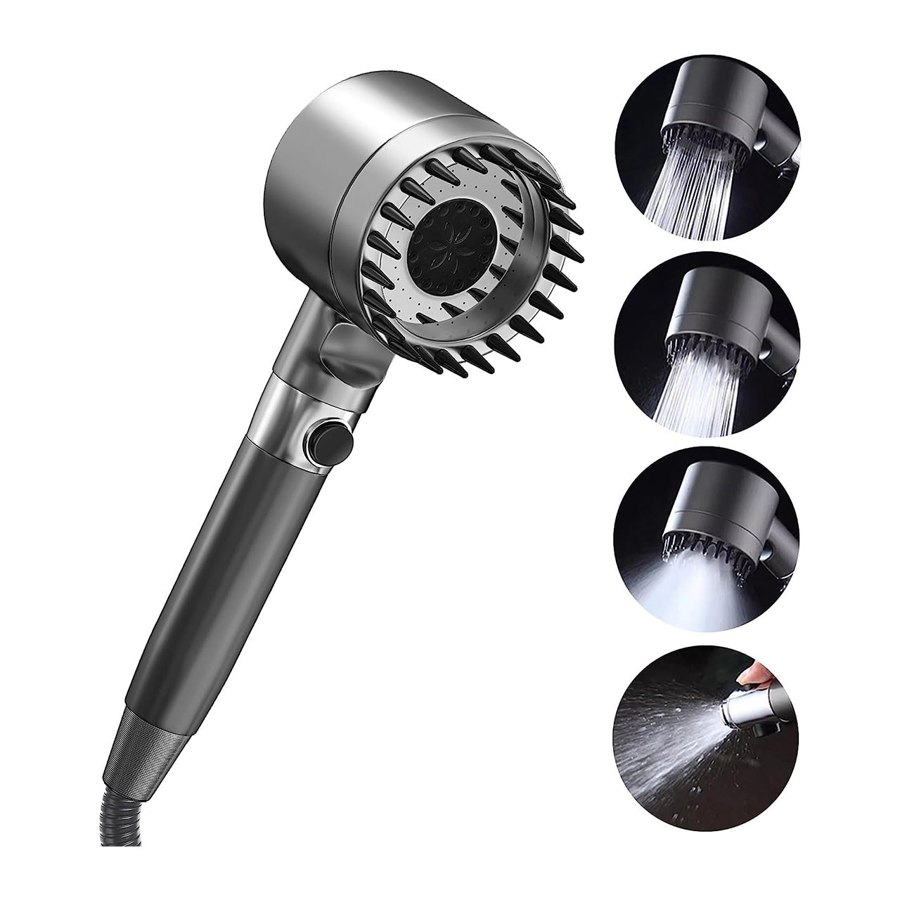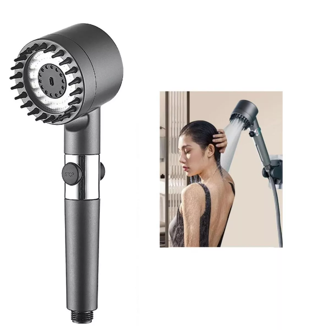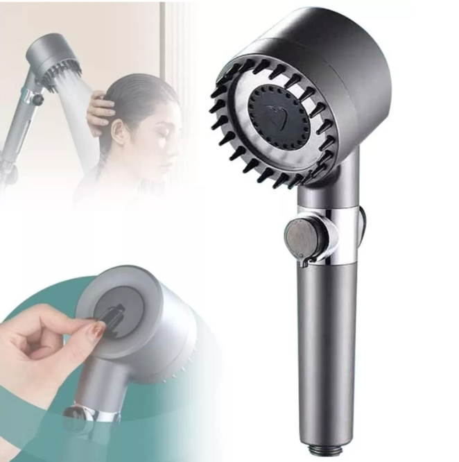 CABEZAL DE DUCHA PULVERIZADORA DE AUMENTO DE PRESION.. Disfruta de una experiencia de ducha de grado spa con nuestra ducha de mano de masaje, tiene 3 modos de pulverización y función de masaje para el cuero cabelludo.. La función de masaje ayuda a aliviar el estrés y la tensión del cuero cabelludo y el cuerpo, haciendo que tu hora del baño sea rejuvenecedora.. Este cabezal de ducha hecho con material ABS duradero, que puede durar mucho tiempo.. Este cabezal te ayudara a ahorrar más agua que una ducha normal.. La potente presión del agua es lo suficientemente suave para tu cuerpo cansado en cuestión de minutos.. Este cabezal de ducha de mano ofrece 3 modos de riego, que son pequeño, mediano y máx. Puede controlarlo fácilmente con el interruptor de palanca.