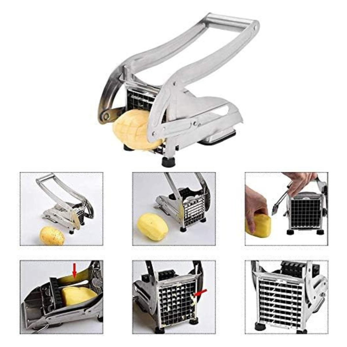 Transforma la experiencia de preparar tus comidas favoritas con nuestro Cortador de Papas Fritas de Acero Inoxidable. Diseñado con materiales de calidad premium y características innovadoras, este cortador no solo facilita la creación de papas fritas perfectas, sino que también ofrece versatilidad para cortar una variedad de verduras y frutas.- Materiales de Calidad Premium: Fabricado con acero inoxidable duradero de calidad superior, este cortador de papas fritas prescinde del plástico, garantizando una herramienta resistente y duradera. La base de succión asegura un agarre seguro en superficies lisas.- Diseño Perfecto: El mango extendido y ergonómico hace que el proceso sea más fácil. La hoja súper afilada con diseño de acero inoxidable resistente, cuenta con un mecanismo de palanca duradero aseguran una larga vida útil.- Corte de 2 Cuchillas:Equipado con 2 cuchillas intercambiables de alta resistencia: una hoja de 36 agujeros para cortes rústicos, cuenta con una hoja de 64 agujeros para cortes delgados. Ideal para papas, calabazas y una variedad de frutas o verduras.- Fácil de Usar:Las patas resistentes y la base de ventosa proporcionan un apalancamiento óptimo durante el corte. La limpieza es fácil recomendando lavar a mano para mantener la nitidez de los insertos de corte. Simplemente reconstruye, enjuaga con agua jabonosa, luego deja secar al aire.- Multiuso:Crea papas fritas en trozos de 1/2" rápidamente, obteniendo resultados sorprendentes. Además, es perfecto para cortar pepinos, calabacines y otras verduras o frutas. Ahora podrás disfrutar de papas fritas con calidad de restaurante en la comodidad de tu hogar.